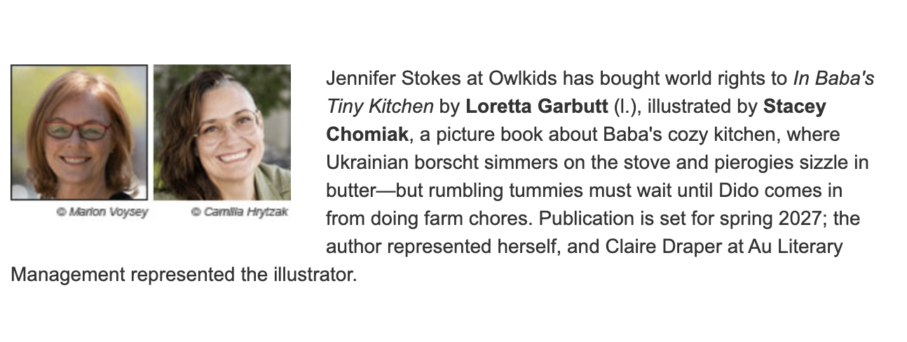 Feb 19, 2026 – OwlKids IN BABA’S TINY KITCHEN (written by Loretta Garbutt) was announced today in Publisher’s Weekly! So excited for this to pub in 2027 🙂