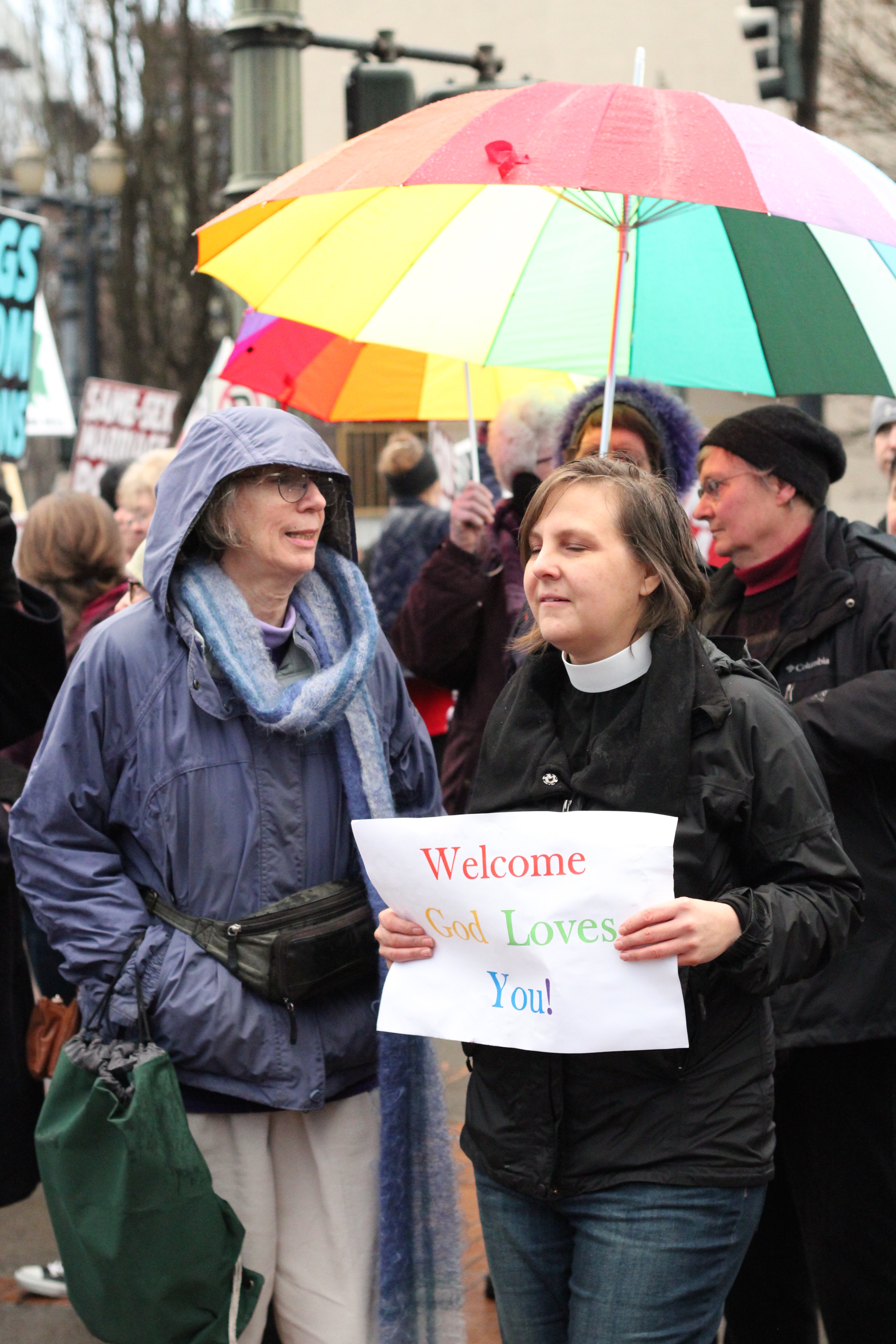 It was an opportunity for me to love better – and to be loved better by total strangers. As a group of us GCN regulars gathered early to walk with new conference attendees so they wouldn’t feel scared walking by Westboro – we saw that a group from churches around Portland were already there waiting for us. Colourful signs in tow, they lined up smiling and cheering us on, and shouting that they love us.