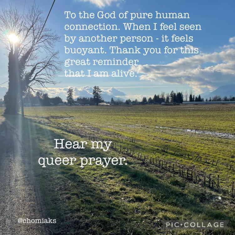 To the God of pure human connection. When I feel seen by another person – it feels buoyant. Thank you for this great reminder that I am alive. Hear my queer prayer.