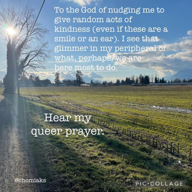 To the God of nudging me to give random acts of kindness (even if these are a smile or an ear). I see that glimmer in my peripheral of what, perhaps, we are here most to do. Hear my queer prayer.