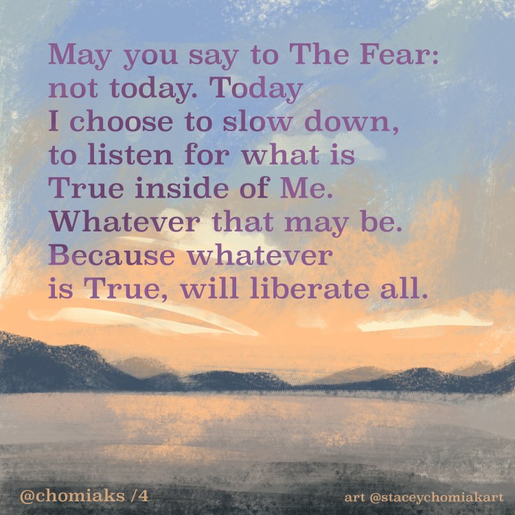 May you say to The Fear: not today. Today I choose to slow down, to listen for what is True inside of Me. Whatever that may be. Because whatever is True, will liberate all.
